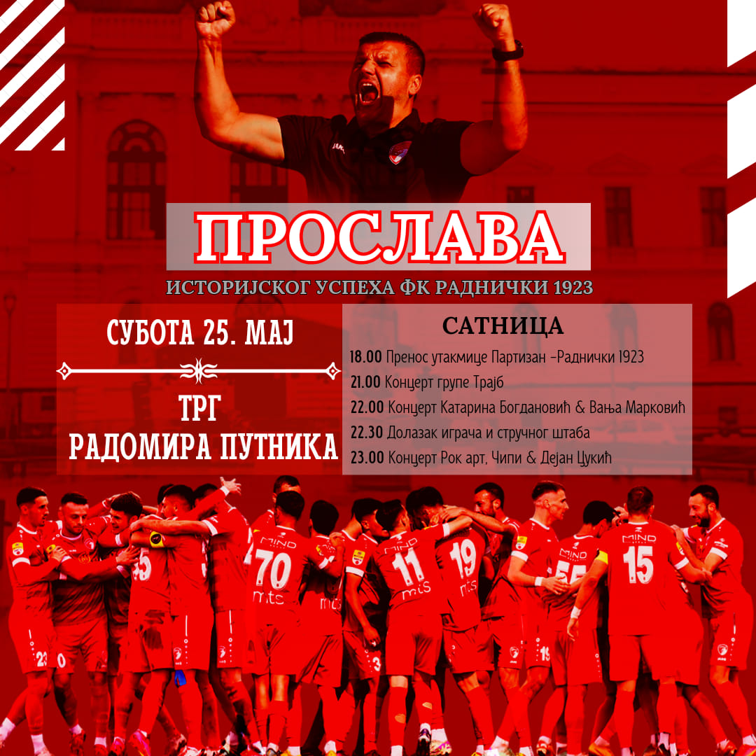 – Dođite da zajedno proslavimo istorijski plasman u Evropu! Pozivamo vas na još jedno zajedničko druženje na Trgu Radomira Putnika povodom istorijskog uspeha našeg kluba, koji je izborio plasman u evropska takmičenja., poručuju Kragujevčanima iz fubalskog kluba Radnički 1923. Program počinje u 18 časova direktnim prenosom utakmice poslednjeg 37. kola Mocart Bet Superlige između Radničkog 1923 […]