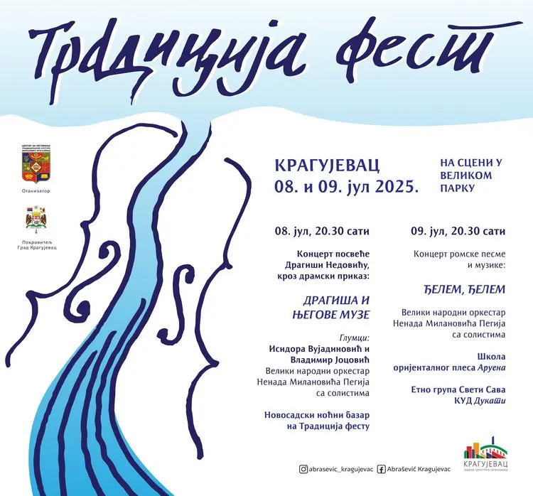 Kragujevac, grad sa imidžom roka, ne umanjuje našu želju da događaji kao što je Tradicija fest sa drugačijim muzičkim konceptom budu dostupni našim sugrađanima, kaže Ana Petrović, članica Gradskog veća za kulturu i dodaje da je dobro organizovati više manifestacija u ovom duhu. Četvrta je godina zaredom kako se festival održava u organizaciji Centra za negovanje tradicije i kulture Abrašević pod pokroviteljstvom Grada Kragujevca, dodaje ona, ove godine na prostoru Velikog parka i uz bogat kulturno-umetnički program. Prvo veče posvećeno stvaralaštvu Dragiše Nedovića, drugo veče romskoj muzici a program upotpunjava bogati, raskošni noćni bazar izlagača iz čitave Srbije. Članica Gradskog veća je pozvala Kragujevčane i goste da planiraju i odvoje vreme da uživaju u muzici, mirisima i ukusima Tradicija festa, u utorak i sredu, 8. i 9. juna od 20 sati.