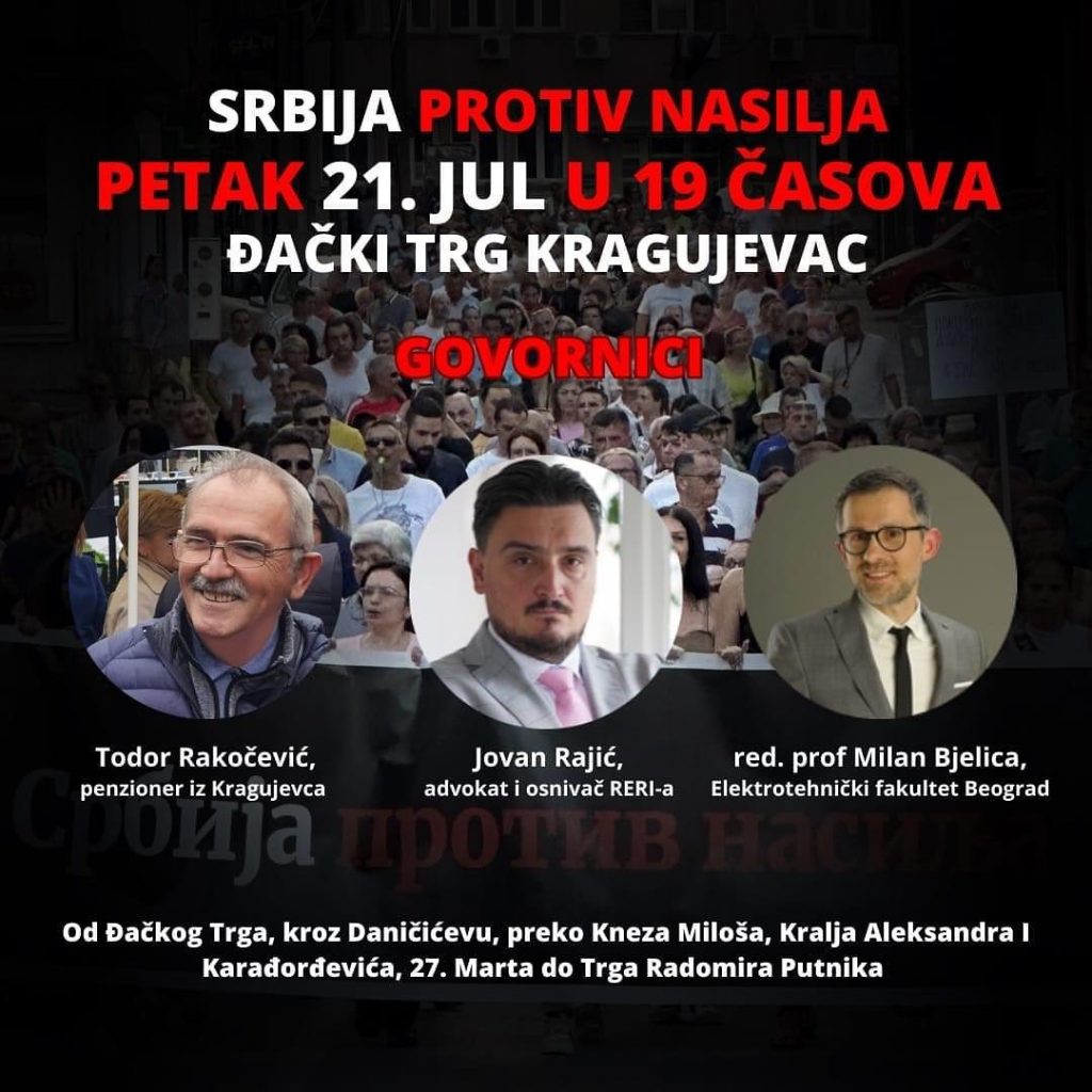 Kao govornici najavljeni su Todor Rakočević, penzioner i kolumnista „Kragujevačkih”, Jovan Rajić, advokat i osnivač RERI-a i redovni profesor Milan Bjelica, sa Elektrotehničkog fakulteta u Beogradu.